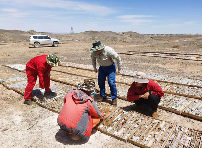 新疆鑫匯公司的野馬泉西金礦項(xiàng)目工作區(qū)距離哈密市155公里,工期為6-10月,需完成6千米的鉆探工作任務(wù)、16平方公里的地質(zhì)剖面等。礦區(qū)內(nèi)山丘連綿不絕,自7月開始,每天下午礦區(qū)地面溫度均超過普通溫度計(jì)的最高刻度,屬于“爆表”狀態(tài)。因工作任務(wù)緊,地質(zhì)隊(duì)員們每天早上7點(diǎn)出發(fā),中午之前要返回基地,傍晚重新出發(fā),22點(diǎn)前趕回基地,開展剖面測(cè)量和鉆探編錄工作,以避開正午的酷熱。為了不被灼傷,地質(zhì)隊(duì)員和鉆探工人把自己包裹得嚴(yán)嚴(yán)實(shí)實(shí),手拎地質(zhì)錘敲下每一個(gè)礦化線索,身背樣品包裝載好沉甸甸的希望。汗水浸濕衣衫,腳底磨出老繭,他們踏遍了礦區(qū)的角角落落,最終繪制出整個(gè)礦區(qū)的礦化藍(lán)圖。