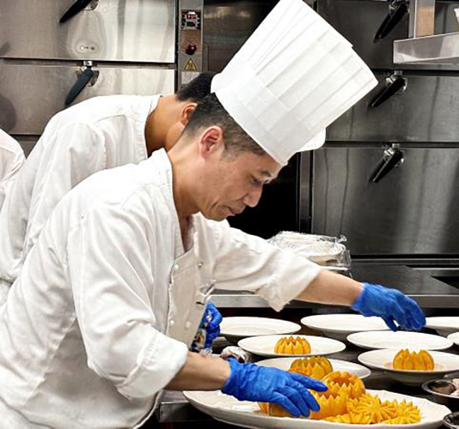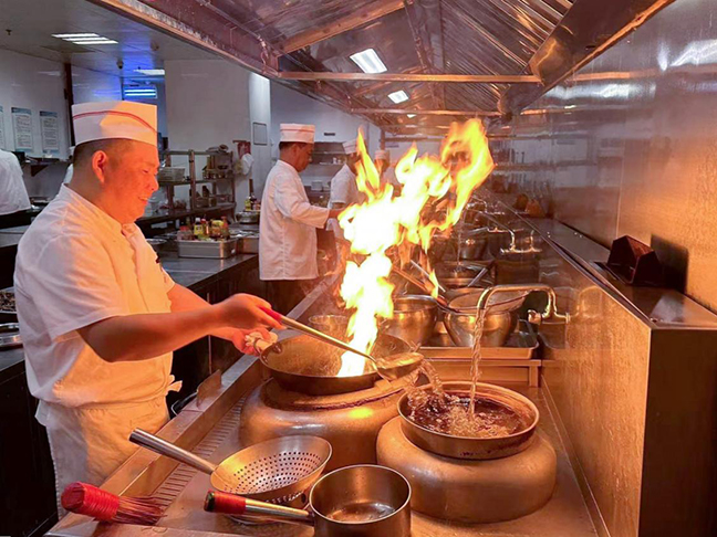 在鹽城迎賓館、國(guó)投大酒店、鹽城萬豪酒店,后廚內(nèi)各類蒸煮設(shè)備持續(xù)釋放出熱氣。為了客人味蕾的享受,在高達(dá)四五十?dāng)z氏度的廚房里,廚師們?cè)谠钆_(tái)前忙活,耐心細(xì)致地烹飪著每一道菜肴,洗鍋、倒油、下主料、添配菜,他們一手端著鐵鍋,一手用力翻炒,炙熱的火焰不時(shí)從鍋中竄出。對(duì)于廚師來說,每年7月到9月都是一場(chǎng)漫長(zhǎng)的考驗(yàn),由于大部分后廚油煙大,不適合安裝空調(diào),用大功率風(fēng)扇又會(huì)影響烹飪,所以廚師們的工作服幾乎都是濕的,而正是因?yàn)橛辛怂麄冊(cè)诟邷叵碌膱?zhí)著堅(jiān)守,才有了滿足人們味蕾的美味菜肴。