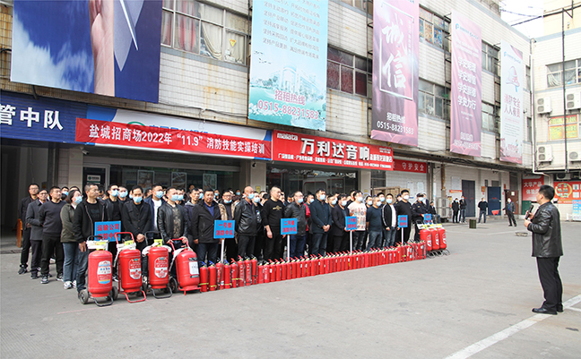 11月9日下午,鹽城招商場組織開展“119”消防宣傳月消防技能實操演練活動。市場相關(guān)部門、駐場城管中隊、義務(wù)消防隊員、市場保潔員、商戶代表共200余人參加活動。