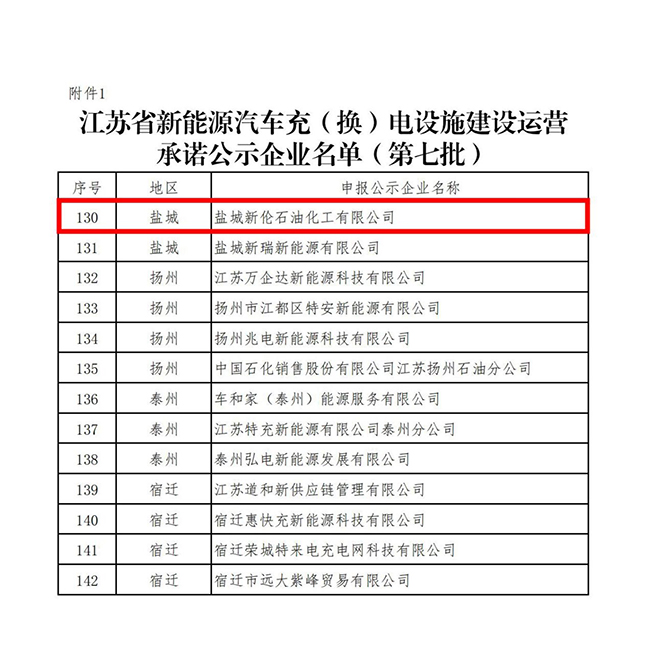 日前,省工信廳發(fā)布了《江蘇省新能源汽車充(換)電設(shè)施建設(shè)運(yùn)營承諾公示企業(yè)(第七批)名單》,鹽城新倫石化公司榜上有名,正式納入我省電動(dòng)汽車充電設(shè)施運(yùn)營服務(wù)商目錄。