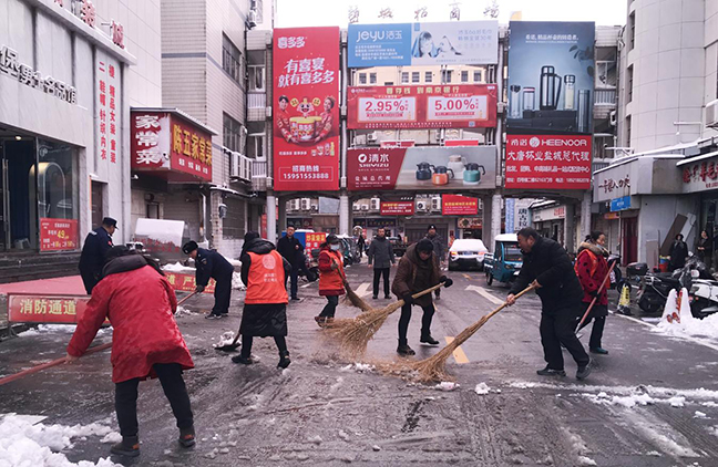 鹽城招商場“聞雪而動”,組織市場管理人員、保潔人員、商戶志愿者到周邊道路、停車場、居民樓坡道開展義務(wù)掃雪活動,并做好宣傳發(fā)動工作,動員市場商戶積極參與到活動中來。大家干勁十足、團(tuán)結(jié)協(xié)作、有序清理,市場周邊積雪情況得到了極大緩解,及時保障了消費者及來往行人的出行暢通。同時,公司還組織人員赴各號樓逐層檢查,排除冰棱墜落安全隱患,進(jìn)一步保障人員出入安全。
