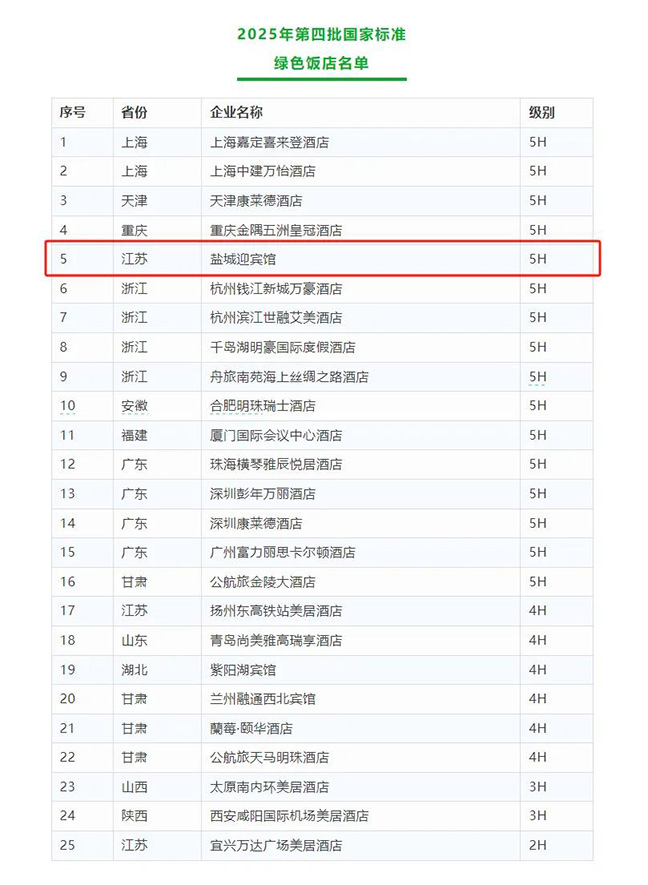近日,中國(guó)飯店協(xié)會(huì)公布了2025年第四批國(guó)家標(biāo)準(zhǔn)綠色飯店名單,鹽城迎賓館憑借在綠色發(fā)展領(lǐng)域的卓越表現(xiàn)獲評(píng)“五葉級(jí)中國(guó)綠色飯店”稱號(hào)。在本次評(píng)選中,成為江蘇省唯一獲此殊榮的酒店,全國(guó)僅16家酒店獲此稱號(hào)。