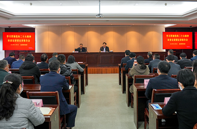為深入學(xué)習(xí)貫徹黨的二十大精神,扎實(shí)推動(dòng)黨的二十大精神入腦入心、走深走實(shí),根據(jù)市委統(tǒng)一部署,12月3日上午,學(xué)習(xí)貫徹黨的二十大精神市委宣講團(tuán)宣講報(bào)告會(huì)在鹽城國(guó)投集團(tuán)舉行。市委宣講團(tuán)成員、鹽城工學(xué)院黨委常委、宣傳部部長(zhǎng)奚新國(guó)作宣講報(bào)告。集團(tuán)黨委書記、董事長(zhǎng)張林海主持報(bào)告會(huì)并講話。集團(tuán)黨委班子成員,市委派駐集團(tuán)黨建工作指導(dǎo)員陳中才,集團(tuán)中層以上干部參加報(bào)告會(huì)。