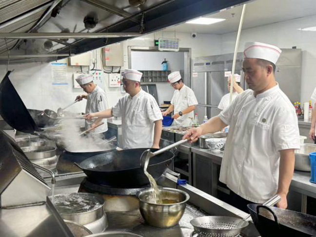在鹽城迎賓館、國(guó)投大酒店、鹽城萬豪酒店,后廚內(nèi)各類蒸煮設(shè)備持續(xù)釋放出熱氣。為了客人味蕾的享受,在高達(dá)四五十?dāng)z氏度的廚房里,廚師們?cè)谠钆_(tái)前忙活,耐心細(xì)致地烹飪著每一道菜肴,洗鍋、倒油、下主料、添配菜,他們一手端著鐵鍋,一手用力翻炒,炙熱的火焰不時(shí)從鍋中竄出。對(duì)于廚師來說,每年7月到9月都是一場(chǎng)漫長(zhǎng)的考驗(yàn),由于大部分后廚油煙大,不適合安裝空調(diào),用大功率風(fēng)扇又會(huì)影響烹飪,所以廚師們的工作服幾乎都是濕的,而正是因?yàn)橛辛怂麄冊(cè)诟邷叵碌膱?zhí)著堅(jiān)守,才有了滿足人們味蕾的美味菜肴。